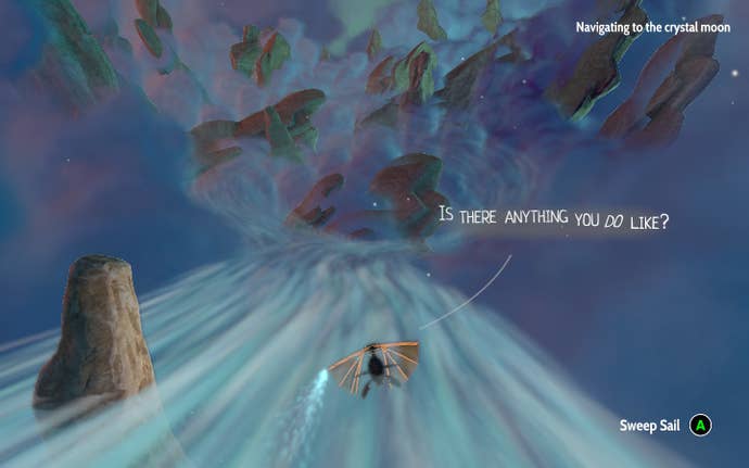 Sailing is simple in control; your left and right bumpers turn your ship idly, while a sweep gives you a slight speed boost (there is no brake). Your robot Six calls out directions when you're sailing en route somewhere, which are sometimes wildly inaccurate. I would turn left like they instructed, only to get the pop-up telling me that I missed my turn. When I reset just before the fork, I'd take the opposite of the suggested direction and find myself on my merry way. Directional arrows are often hard to see in the cloudy rivers too, leading to a lot of missed turns.