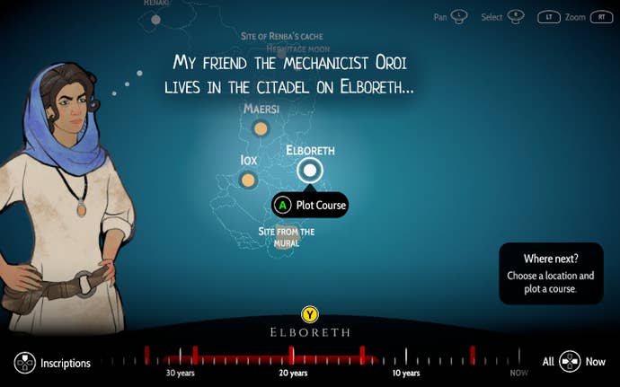 The history you start with in Heaven's Vault is Aliya's own. Near the start, we learn that she's not really from Iox: she grew up in the slums of the moon Elboreth, which is just a short sail away in the surrounding Nebula. She's sent on a task to track down a missing roboticist by the woman who plucked her from Elboreth as a teen, who she has a complicated relationship with. It's here where you begin to shape the story of Heaven's Vault, much like you do your steampunk-aestheticized path around the world in 80 Days. Only at first blush, it's only Aliya you're shaping.