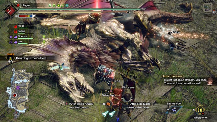 They’re introduced in a simple enough way; you churn through the Master Rank quests in Sunbreak as you would any other Monster Hunter setup, getting to fight bigger and more dangerous prey as you level up. Then, with one urgent quest, the definitely-not-a-dominatrix royal vanguard, Fiorayne, decides to accompany you – there’s a very dangerous monster out there, and some feckless newcomer surely can’t deal with it alone.